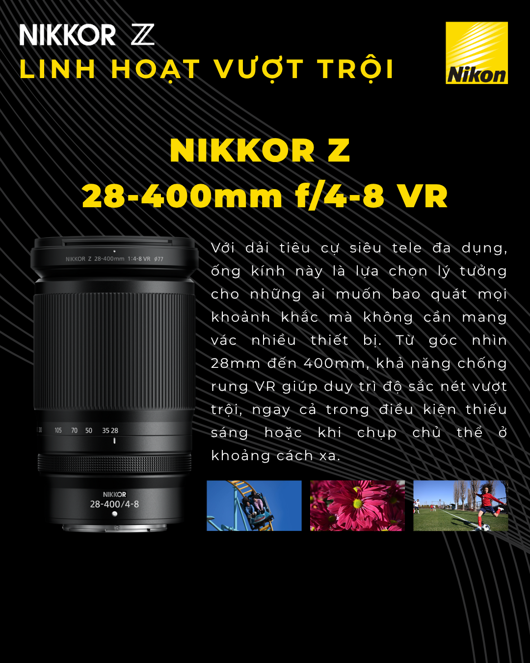 Nếu bạn muốn một ống kính có thể cân mọi thể loại, từ phong cảnh rộng lớn đến những chi tiết xa tít tắp, thì đây chính là lựa chọn số một. Với dải tiêu cự siêu rộng từ 28mm đến 400mm, bạn có thể chụp đa dạng chủ thể mà chẳng cần thay ống kính. Công nghệ chống rung VR tích hợp sẽ đảm bảo ảnh luôn sắc nét, ngay cả khi chụp trong điều kiện thiếu sáng hoặc zoom hết cỡ.